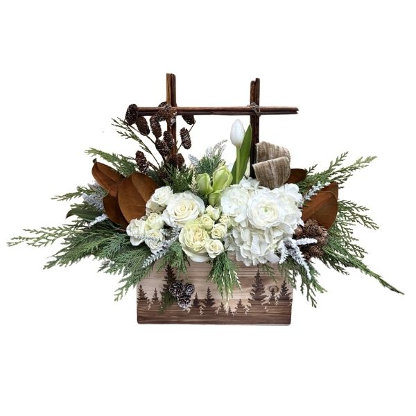 Bring the holiday spirit with this woodsy inspired holiday pinecone flower arrangement! Includes hydrangeas, spray roses, roses, ranunculus, tulips, amaryllis, holiday greenery, and wooden accents arranged in a wooden container with forest impressions.