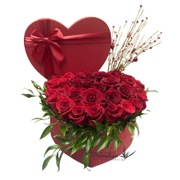Send your love love this Valentine’s Day with this red rose heart arrangement! It includes 3 dozen red roses, greenery, and avante garde heart branches arranged in a red heart box adorned with red ribbon.
