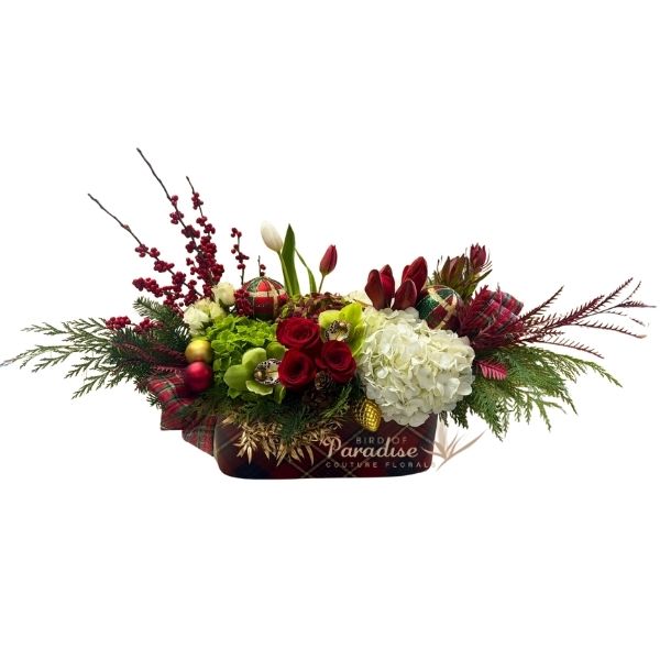 Spread christmas cheer this holiday season with this festive holiday flower arrangement! It includes roses, hydrangeas, tulips, spray roses, orchids, christmas greenery, and holiday ribbon and accents.